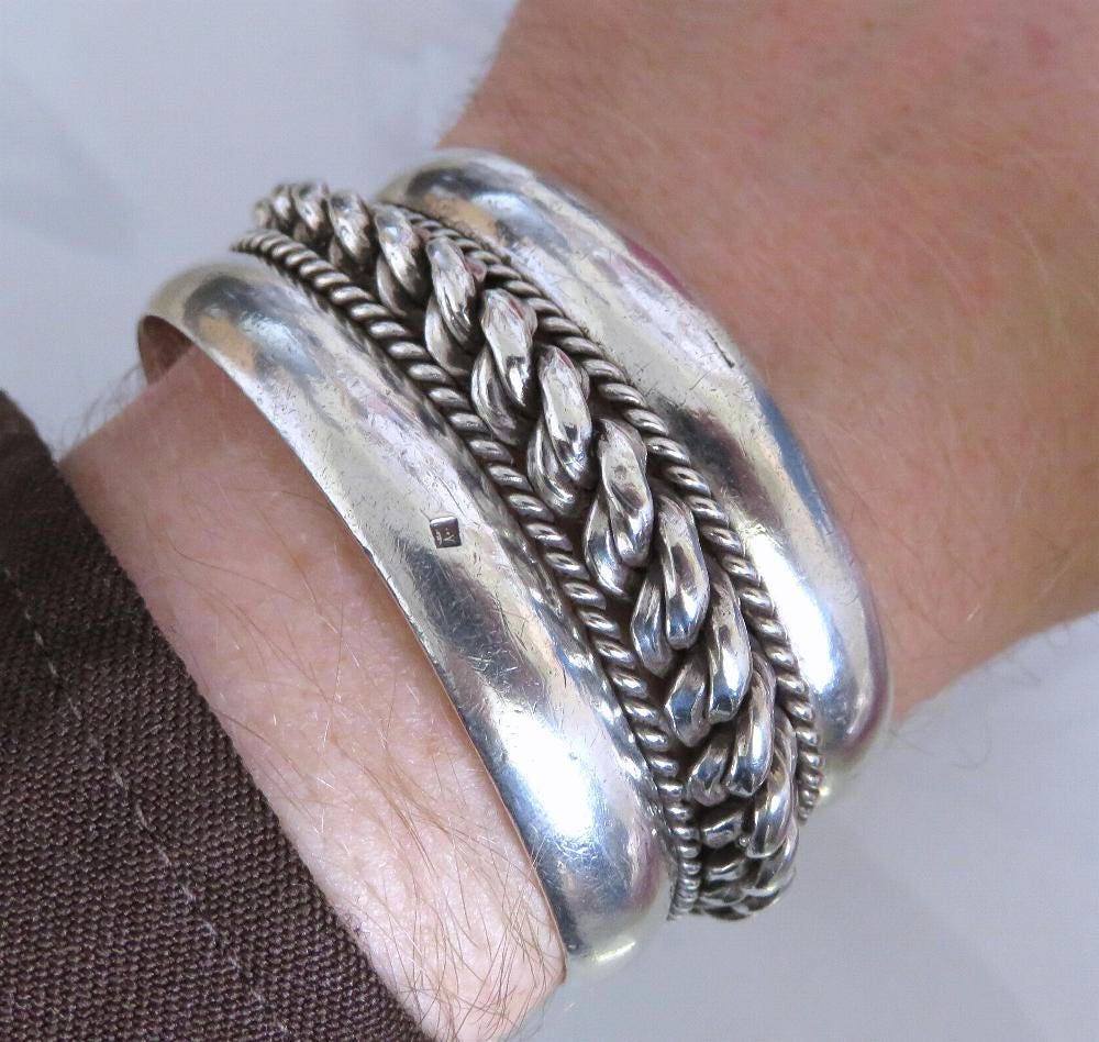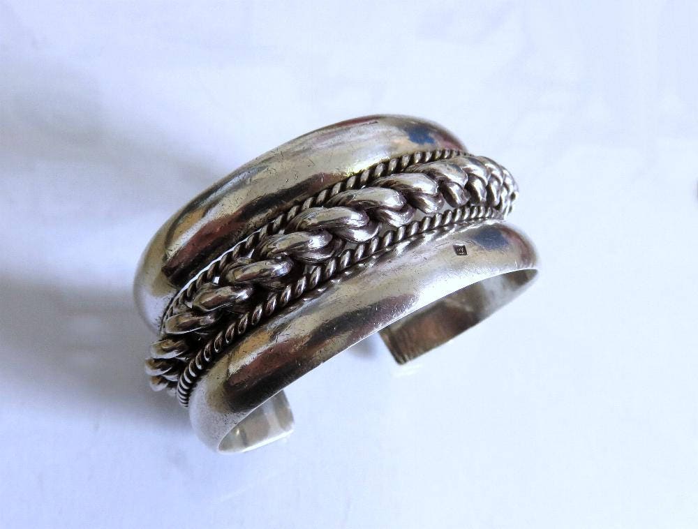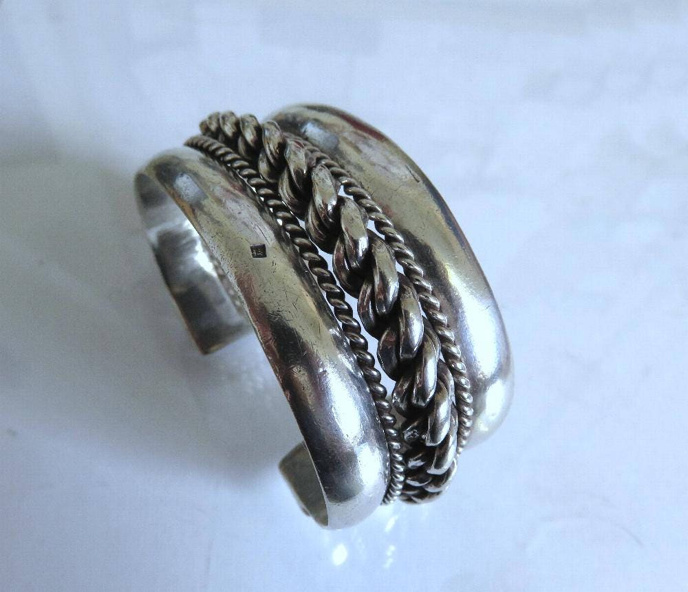 This bracelet was made for Bedouin people in Egypt, Southern Palestine and Jordan.It is made of 80% silver (sterling is 92.5%) and has the three part hallmark of Egypt and a date stamp (worn) From the wear and other marks I date it late 40s.