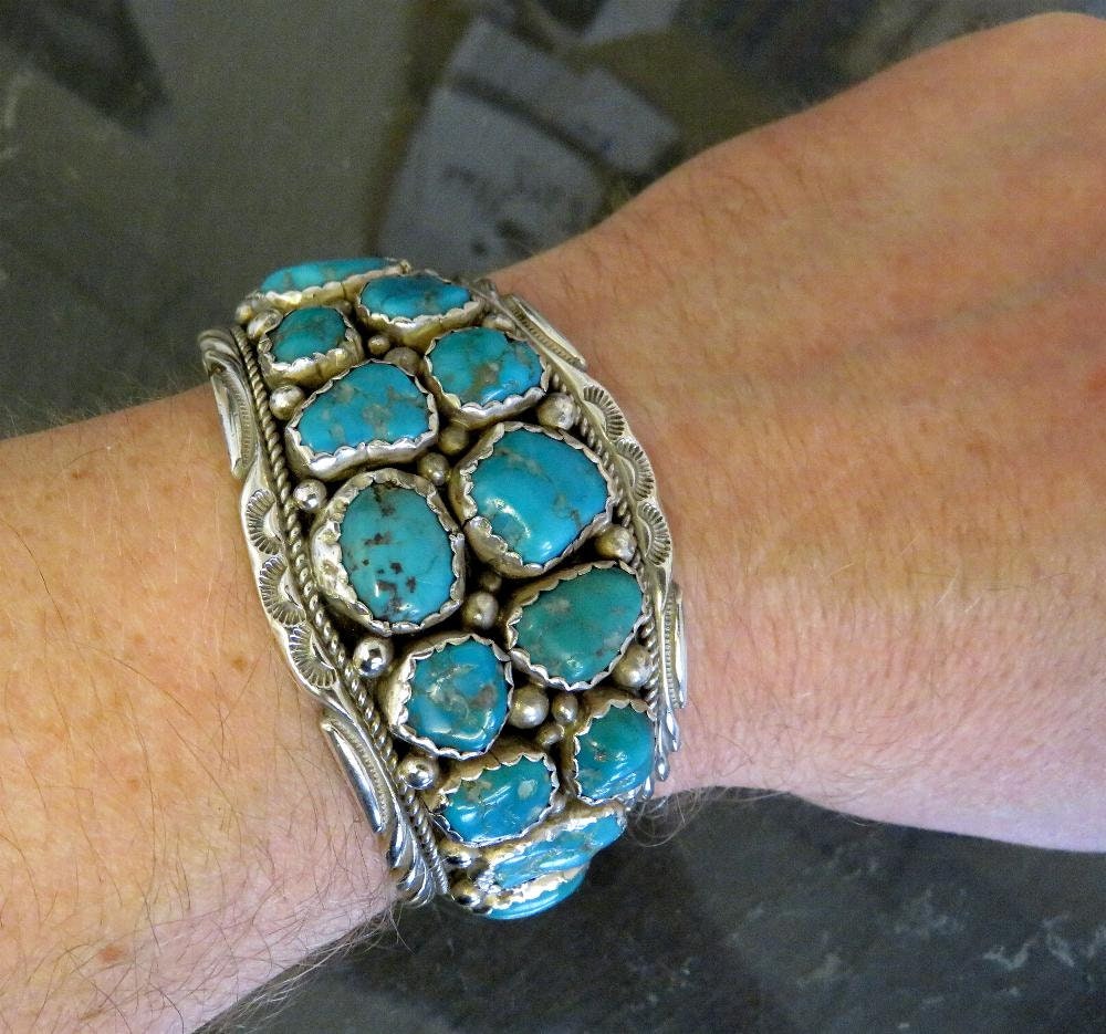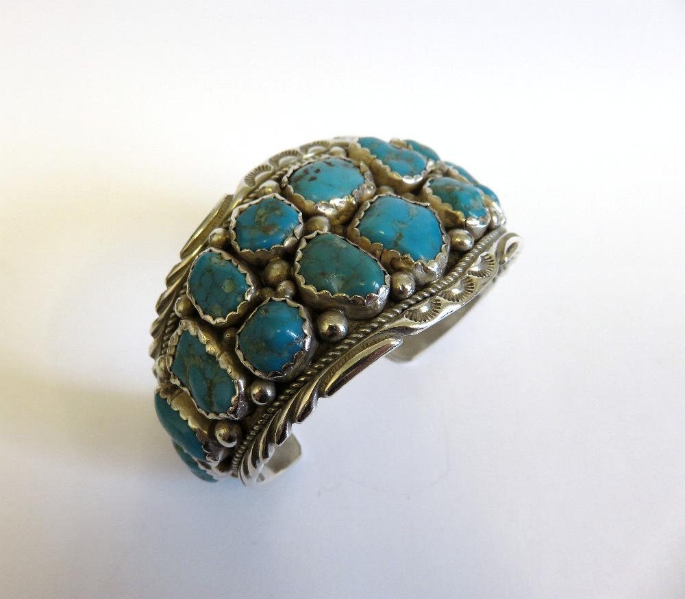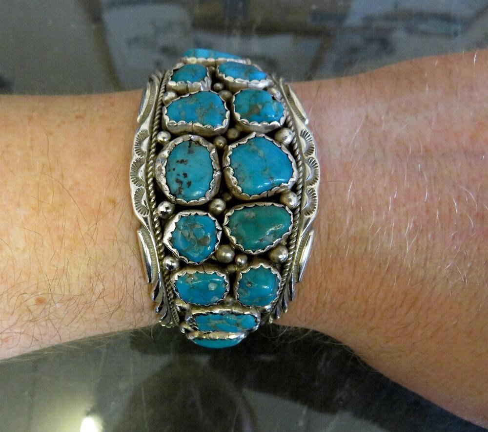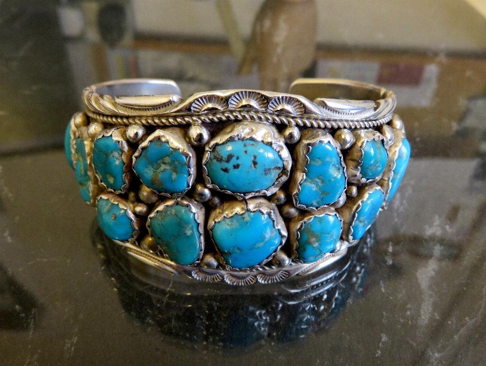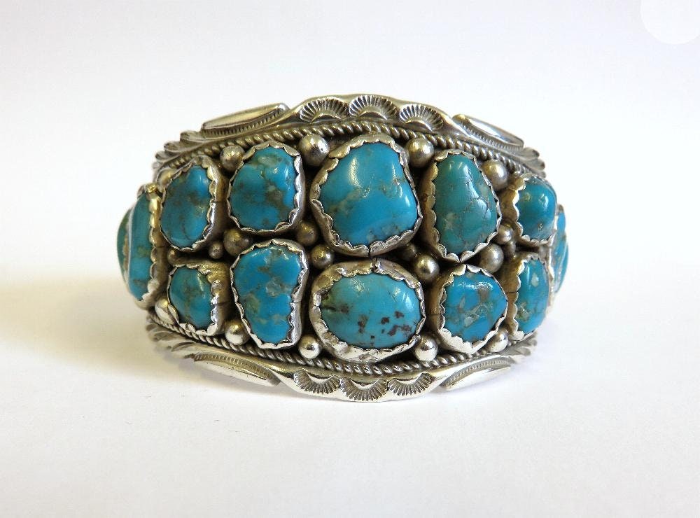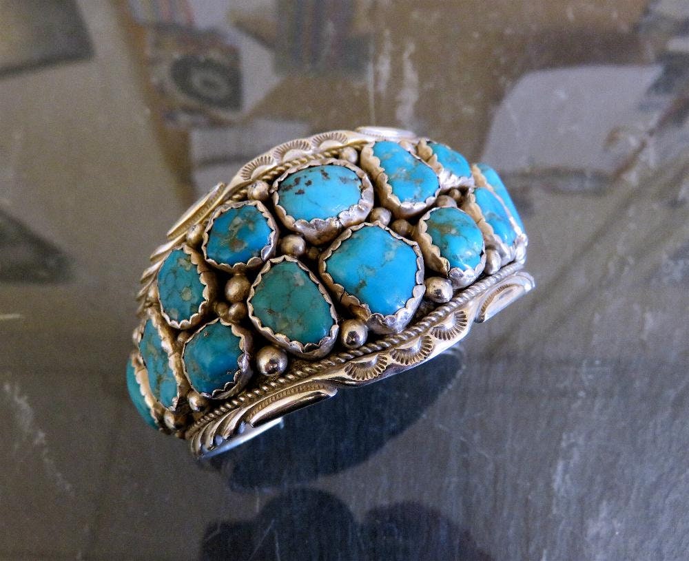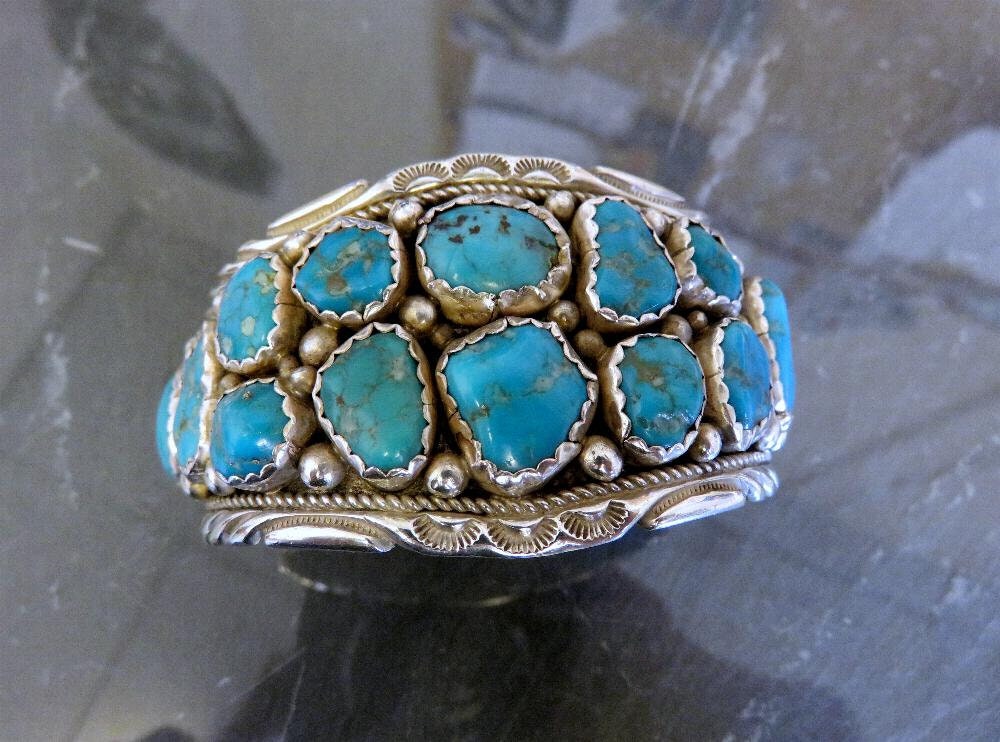 Beautiful vintage sterling silver Navajo turquoise cuff bangle, with traditional stamped details. A very old piece by artisan Florence Tahe